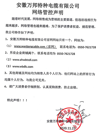 鄭重聲明:安徽萬邦特種電纜有限公司官方網站為:www_wanbangcable_com.hbetter.com,除此之外無任何子網站或合作網站,其余均為假冒偽劣。電話:0550-7621728 13485756353 地 址:安徽省天長市滁州高新技術產業開發區經四路29號